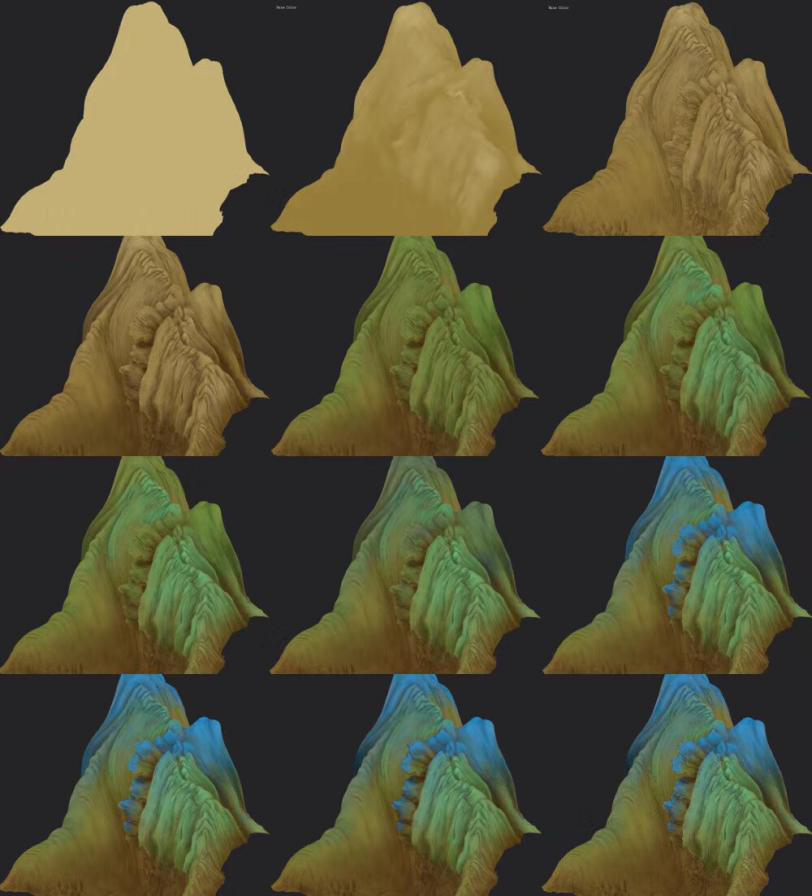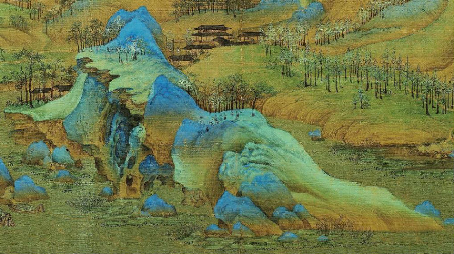 王希孟繪制《千里江山圖》時共有五次著色:水墨粉本,赭石鋪底,石綠,疊加綠色,石青,經過層層疊加,最終形成質感凝重、渾然天成的青綠基調。五次著色才有了《千里江山圖》靈動的色彩效果,這顯然為華強方特的技術團隊帶來了更大的考驗。根據原畫步驟,方特的數字藝術家們前后進行十次數字著色才達到最終以假亂真的效果,為大眾呈現了精彩的《飛越千里江山》。