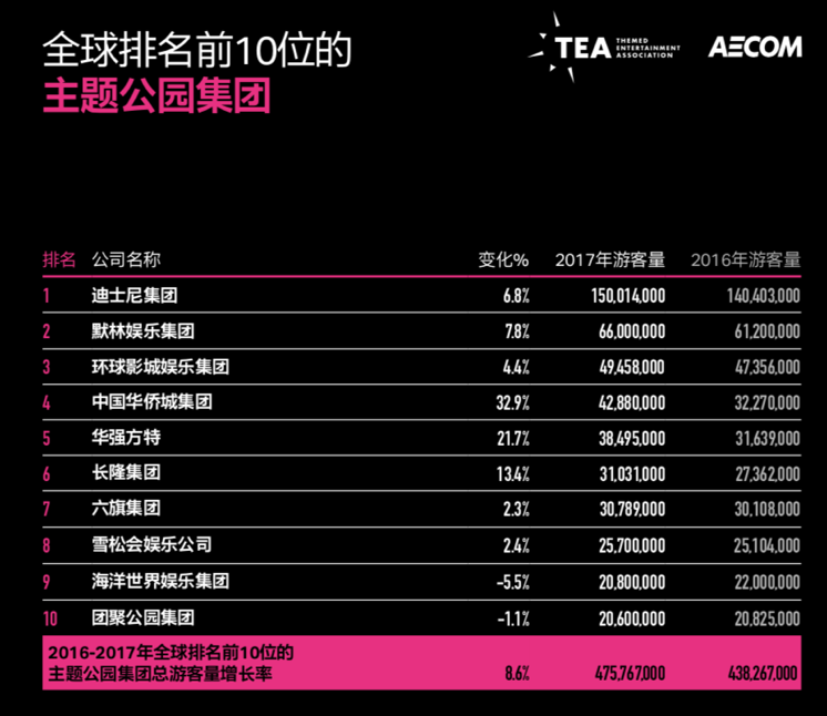 全球排名前十的主題樂園集團;來源:2017年全球主題樂園調查報告TEA&AECOM