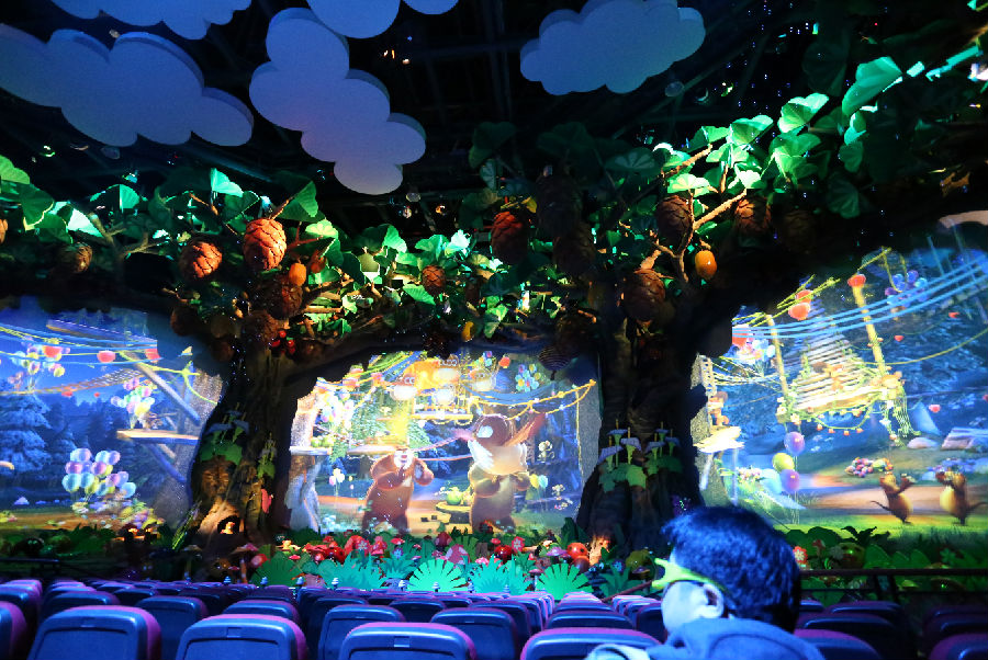 《熊出沒(méi)劇場(chǎng)》中的座椅設(shè)置在大型旋轉(zhuǎn)平臺(tái)上,平臺(tái)前后有兩組可展示不同內(nèi)容的大屏幕。隨著情節(jié)演變,游客們將在兩組屏幕的自由轉(zhuǎn)換中觀賞影片。綜合實(shí)物景觀和大型機(jī)械動(dòng)作模型的環(huán)境4D劇場(chǎng),結(jié)合煙霧、光電等多種特技,通過(guò)這些創(chuàng)新前衛(wèi)的形式演繹引人入勝的劇情,《熊出沒(méi)劇場(chǎng)》讓游客們走進(jìn)一個(gè)有聲、有色、更有真實(shí)感的“熊出沒(méi)”童話,一同感受純真,體驗(yàn)美好,分享笑聲。不僅如此,故事還巧妙地傳遞自然、環(huán)保、健康、快樂(lè)的理念,寓教于樂(lè),讓大朋友與小朋友們都能收獲滿滿。