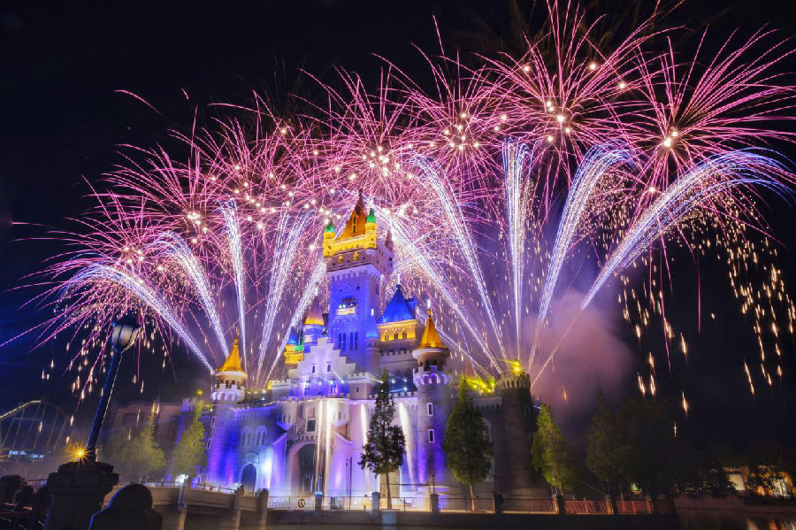 青島方特重金打造的“錢塘集市”也在“五一”正式與游客見面,這一全新的主題文化展示區域,以古典的江南建筑風格還原杭州景象,為園區增添詩情畫意,集市聚集了種類繁多的各地小吃,吸引眾多游客駐足品嘗。全新《錢塘風情》古典演藝實景秀也在“五一”期間上線,帶領游客們夢回南宋,傳統含蓄的古典舞蹈、余音繞梁的古箏表演、動人心弦的雜技表演,令整個演藝引人入勝,讓游客們嘆為觀止、贊不絕口。同時,青島方特《熊夢奇緣》主題煙花秀也華麗回歸,將童話劇情演藝與煙花秀巧妙融合,層層推進的劇情與璀璨煙互為呼應,讓游客真切感受童話氛圍,進入夢幻仙境。