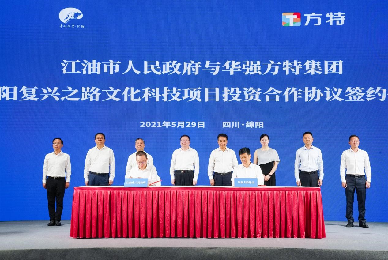 5月29日,綿陽市人民政府與華強方特集團在四川綿陽舉行了合作建設綿陽方特文化旅游項目框架協議簽約儀式;江油市人民政府與華強方特集團正式簽署“綿陽復興之路文化科技項目”投資合作協議。綿陽市、江油市相關政府領導,華強方特集團有關負責人,以及媒體記者和各界人士..