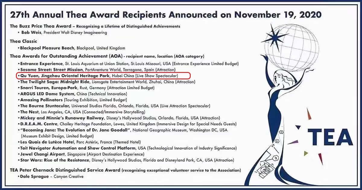 美國當地時間11月19日,國際主題娛樂協會(TEA)公布了第27屆Thea大獎名單,華強方特集團旗下荊州方特東方神畫主題樂園的大型真人演藝特效劇場項目——《屈原》榮獲2020年度“杰出成就獎”。據悉,成立于1991年的主題娛樂協會(ThemedEntertainmentAssociation:TEA)作..