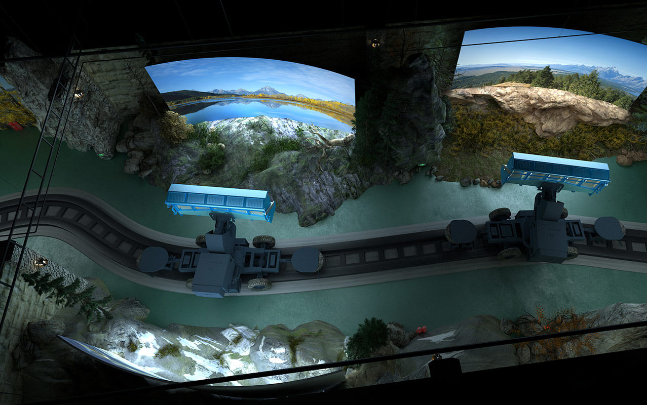 抓舉式動感軌道車項目采用大型搖臂軌道車、球幕與環境場景相結合。其中軌道車輛采用了抓舉式多自由活動的技術,可以根據劇情做出旋轉、上升、下降等多個動作,可以模擬很逼真的飛翔感。